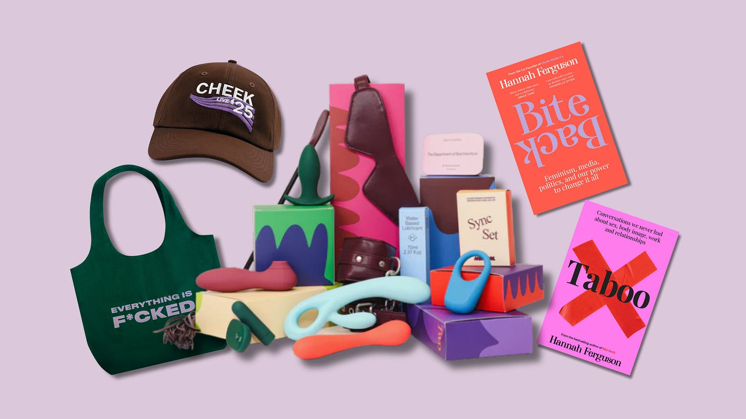 The prize includes limited edition Cheek Tour merch (the Cheek Live Dad Cap and Everything is F*cked Tank Tote), a copy of both of Hannah’s books (Taboo and Bite Back), AND - thanks to our friends at Normal - an incredible 12-day Advent Calendar filled with $1100 worth of luxury vibrators, playful kink gear, wellness essentials and connection tools. The survey will remain open for the rest of the year, with the prize to be drawn in January - you can enter here!